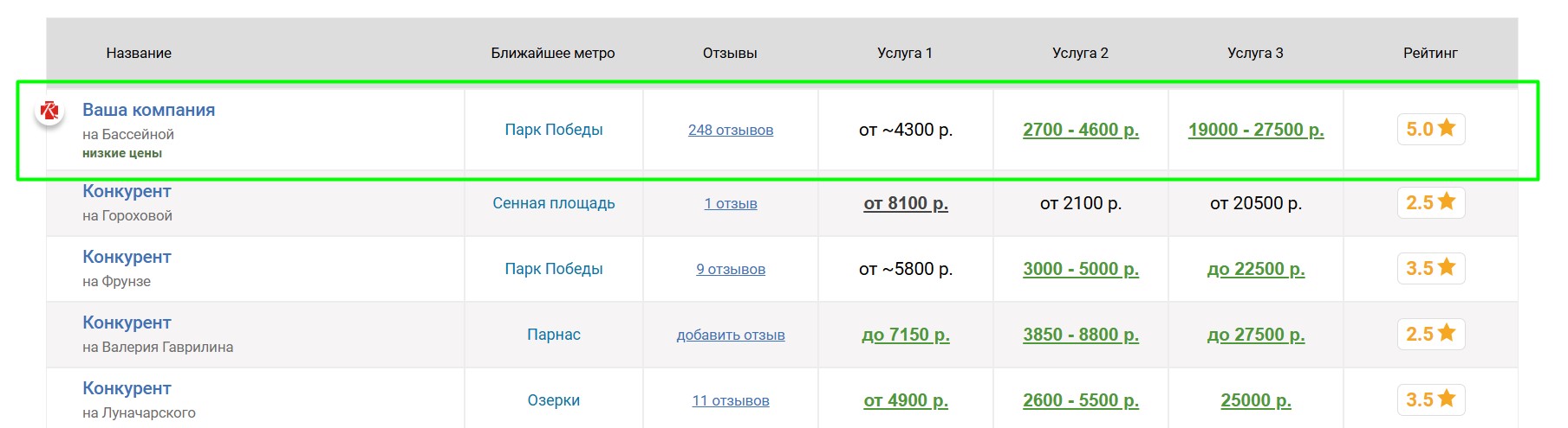 клиник, продвигаемая клиника попадёт к ним в таблицу «Сравнение по ценам», которая выглядит следующим образом: